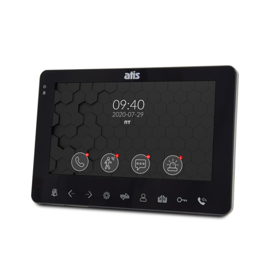 Відеодомофон ATIS AD-780MB з кольоровим 7-дюймовим TFT-екраном, сенсорними кнопками керування і можливістю підключення 2 панелей виклику, 2 аналогових відеокамер, 2 датчиків тривоги і 1 додаткового монітора (телевізора) з НЧ-виходом. Підтримує запис фото/відео, є детектор руху на 4 канали (одночасно запис з 1, де є рух), слот для карти пам'яті до 32ГБ. Колір - чорний.