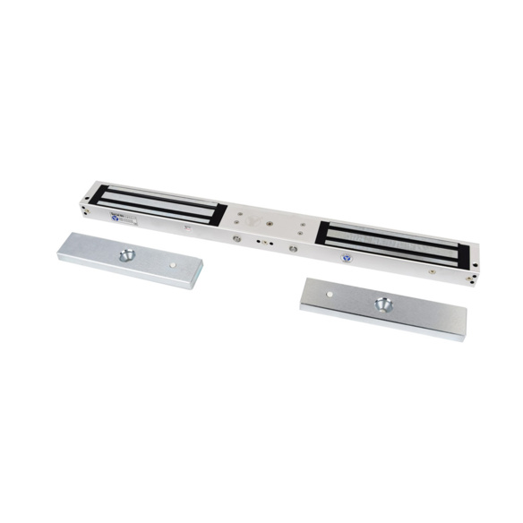 YM-280ND(LED)-DS – накладний електромагнітний замок для двостулкових дверей зі світлодіодною індикацією, датчиком стану замка і дверей з силою утримання до 280 кг*2 на розрив. Є сухі контакти для визначення стану замка (NO, NC, COM) і дверей (NO, NC, COM).
