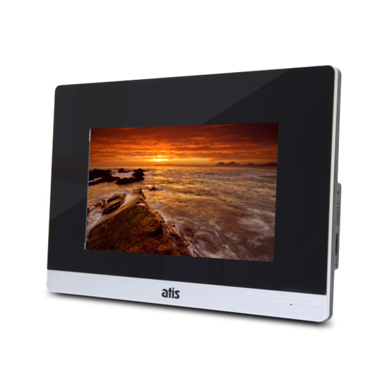 Відеодомофон ATIS AD-750HD S-Black з кольоровим сенсорним 7-дюймовим TFT-екраном, можливістю підключення 2 HD/аналогових панелей виклику, 2 HD/аналогових відеокамер, 2 датчиків тривоги, 3 відеодомофонів і 1 додаткового монітора (телевізора). Колір - чорний зі сріблом.