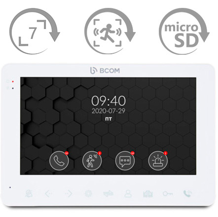 Відеодомофон з кольоровим 7-дюймовим TFT-екраном, сенсорними кнопками керування і можливістю підключення 2 панелей виклику, 2 аналогових відеокамер, 2 датчиків тривоги і 1 додаткового монітора (телевізора) з НЧ-виходом. Підтримує запис фото/відео, є детектор руху на 4 канали (одночасно запис з 1, де є рух), слот для карти пам'яті до 32ГБ. Колір - білий.