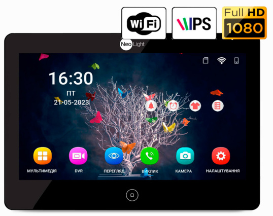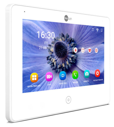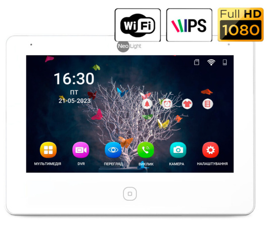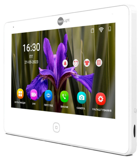 Лаконічний дизайн з максимальними можливостями: має IPS екран з роздільною здатністю 1024 х 600, запис відео та аудіо по руху одночасно на 4 канали, mp3 мелодії на виклик, вбудований Wi-Fi і LAN, підтримка карт до 128 ГБ. Дозволяє переадресовувати дзвінок із відеопанелі на мобільний додаток «NeoLight» (iOS, Android), встановлений на смартфоні або планшеті. Розміри: 186 х 136 х 21 мм, живлення: POE IEEE 802.3af/DC15В/0.8A/AC100-240В 50/60Hz.