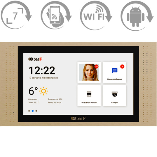 Робота через додаток BAS-IP Intercom, Врізний та накладний монтаж, Відео розмова з гостем, Квадратор, Фоторамка, 9 мелодій виклику,Режим перегляду IP камер, Сценарії, Автовідповідач, Режим “Не турбувати”, Режим “Без звуку”.