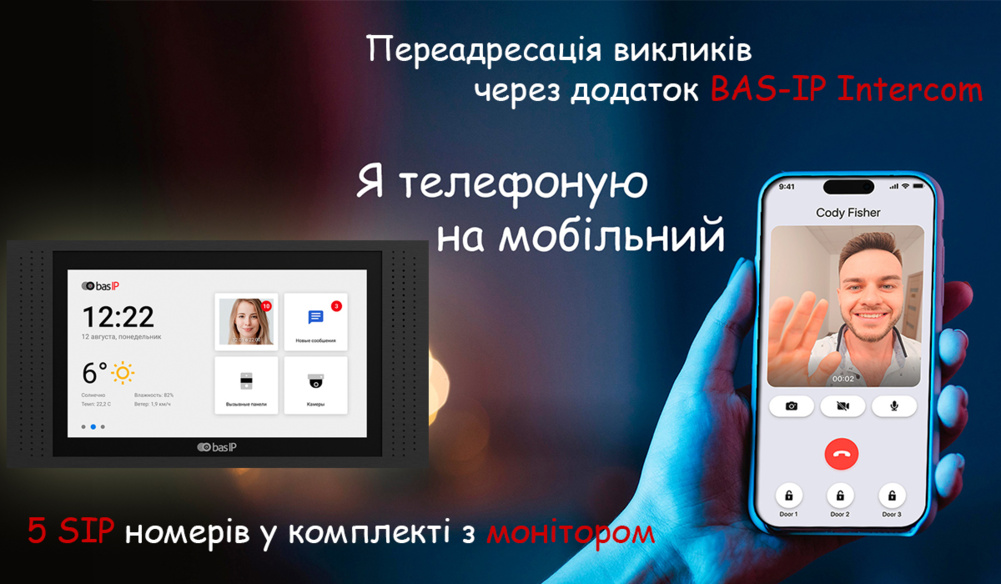 Мобільний додаток: BAS-IP Intercom підтримує переадресацію виклику на смартфон, що дозволяє користувачам контролювати доступ в приміщення і спілкуватися з відвідувачами з будь-якої точки світу за допомогою смартфона або планшета. Потрібно лише встановити додаток та насолоджуватися переадресаціїю виклику.