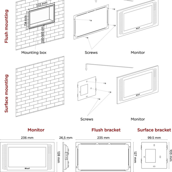 Зручний тип монтажу (настінний або прихований (магнітний кронштейн у комплекті) дозволяє легко встановити систему в будь-якому місці. Крім того, вибір типів екрану в режимі очікування (квадрат, годинник, фоторамка, тайм-тур, IP-камера) покращує естетику та функціональність.