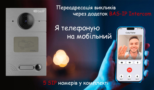 Робота через додаток BAS-IP Intercom, Відео розмова з гостем, Вхід Wiegand 26, 34, 58, 4 поліфонічні мелодії, SIP P2P.