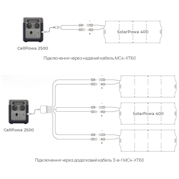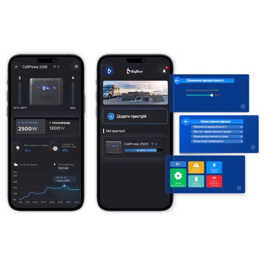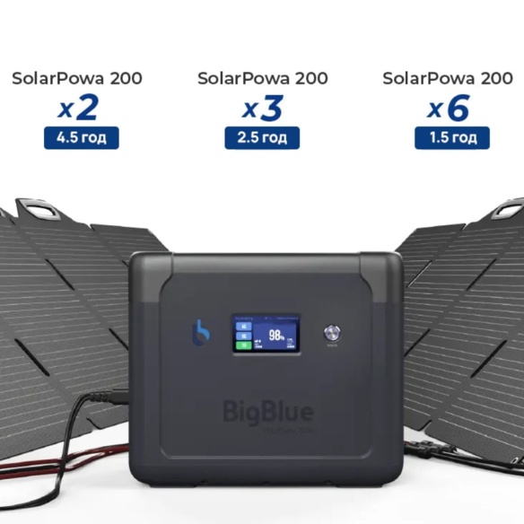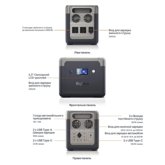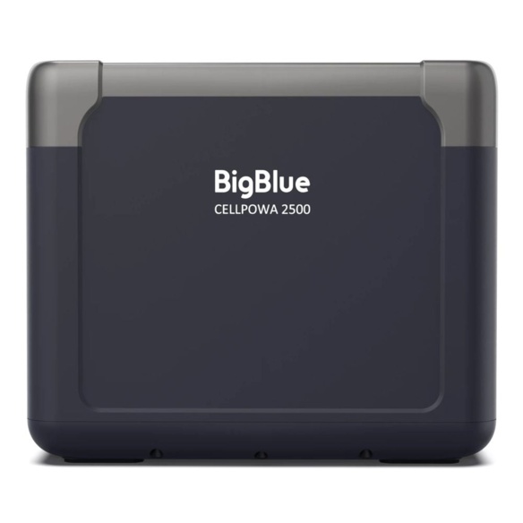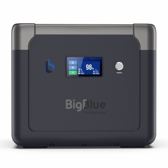 Портативна зарядна станція BigBlue CP2500 з функцією ДБЖ, з номінальною потужністю 2500 Вт, піковою потужністю 5000 Вт, вихідна напруга 230 В, чиста синусоїда. Вбудована акумуляторна батарея LiFePO4 потужністю 1843 Втг. Зарядна станція може одночасно заряджати до 11 пристроїв (завдяки вбудованим вихідним портам). Можливість заряджання станції від електромережі (вбудований зарядний пристрій 1200 Вт), від сонячних панелей максимальною потужністю 1200 Вт (слід придбати окремо), від прикурювача (зарядний кабель у комплекті). Час заряду від електромережі до 80% становить 1.5 години.