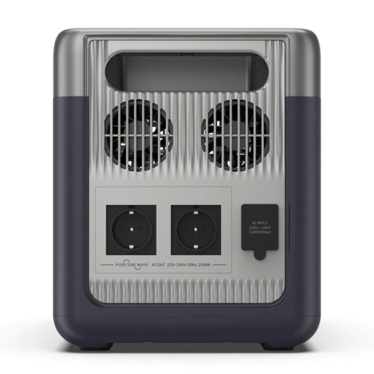 Портативне джерело живлення потужністю 2500 Вт/230 В (чиста синусоїда), з режимом ДБЖ, пікова потужність 5000 Вт. Сенсорний 4.3" дисплей, підтримка керування з мобільного застосунку через вбудований WiFi/Bluetooth, GPS-функція. Вбудована LiFePO4 акумуляторна батарея потужністю 1843 Втг; вбудований зарядний пристрій 1200 Вт; вхід для сонячних панелей 12-65В/22.5А 1200 Вт макс.; вхід автомобільної зарядки: 12-24В/10А 120 Вт; вихід змінного струму: 2 порти 230 В 2500 Вт; вихід постійної напруги: 2 порти DC5521 12В/5А загальною потужністю 120 Вт, 1 вихід автомобільної зарядки («прикурювач») 12В/10А 120 Вт; вихід USB-А QC3.0: 2 шт. 5В/3А, 9В/2А, 12В/1.5А загальною потужністю 36 Вт; порти USB-C: 2 порти PD 100Вт 5В/3А, 9В/3А, 12В/3А, 15В/3А, 20В/5А, макс. загальна потужність 200 Вт, 2 порти PD 45Вт 5В/3А, 9В/3А, 12В/3А, 15В/3А, 20В/2.25А, макс. загальна потужність 90 Вт; кількість циклів розряду-заряду АКБ ≥3500; час зарядки до 80% 1.5 години; робоча температура +10 °C ~ +30 °C; розміри 384 / 274 / 325 мм, вага 26 кг