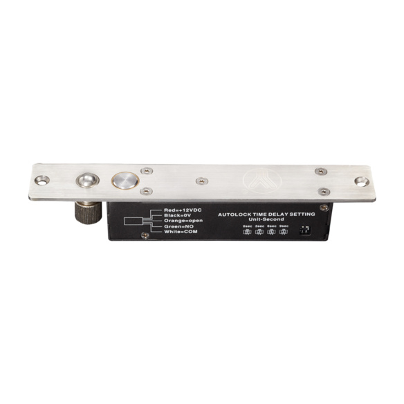 Оснащений вбудованим таймером затримки закривання 0 | 3 | 6 | або 9 сек. (перемикається перемичками на замку) і датчиком стану дверей. Замок відкритий за замовчуванням (без живлення).